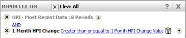 Specify the value(s) for the condition This is a free format entry field. The metric value(s) specified are combined with the Comparison Operator to determine if an individual data record is included in the output. Note: When entering values for percentages, enter the value as a decimal (e.g., in the example the comparison value is 6% for 1 Month HPI Change and is entered as 0.06 rather than 6%). If you wish